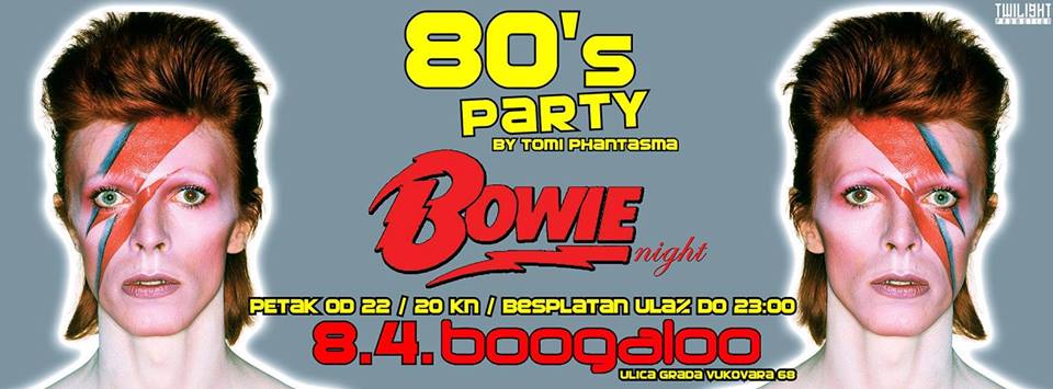 Nakon vrlo uspješnog otvorenje nove sezone 80’s Partya u zagrebačkom Boogaloo Clubu, u petak 8. travnja nastavljamo s večeri posvećenoj jednom od najvećih glazbenika, legendarnom David Bowieu. Nakon promocije novog albuma „Blackstar“ u zarebačkoj Jabuci 15. siječnja koja se na našu veliku žalost poklopila i sa oproštajem ovog velikana smo primjetili da nije bilo osim toga niti jedan party posvećen David Bowieu pa želimo ispravit tu grešku i ponovno se prisjetiti njega i njegovog šarenog glazbenog opusa. Tako će na repertoaru biti audio i video presjek Bowieove karijere, ovoga puta u… malo veselijem stilu nego u Jabuci pa će na repertoaru biti svi njegovi hitovi od početka karijere do posljednjeg albuma tj. Space Oddity, Changes, Sound & Vision, Ziggy Sturdust, Fame, Young Americans, Heroes, Boys Keep Swinging, DJ, Let’s Dance, Modern Lovers, Absolute Beginners, Under The Presure, Filthy Heart Lesson, I’m Afraid Of Americans, Ashes To Ashes, Scary Monsters, Wild Is The Wind, Fashion, The Jean Genie, Rebel, Rebel, John, I’m Only Dancing, China Girl, The Man Who Sold The World, Golden Years, Starmen, Velvet Goldmine, Suffragette City, Five Years, Life On Mars?, The Next Day, The Stars (Are Out Tonight), ……