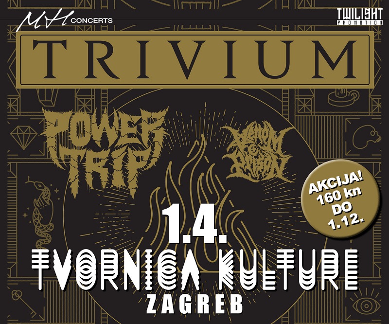 U nedjelju 01. travnja će u zagrebačkoj Tvornici Kulture nastupiti američki Trivium, jedan od trenutno najzanimljivijih bendova na metal sceni. Trivium dolaze iz Orlanda na Floridi, SAD i djeluju od 1999. godine. Poznati su po svojoj stilskoj mješavini heavy metala, metalcorea, thrash metala i melodičnog death metala. Svoj prvi album „Ember to Inferno“ su objavi 2003. godine za manje poznatu diskografsku kuću Lifeforce. 2004. potpisuju za prestižnu diskografsku kuću Roadrunner i za njih objavljuju osam albuma i dvadesetak singlova. Do sada su prodali više od milijun albuma diljem svijeta. Posljednji album „The Sin and the Sentence“ je objavljen 20. listopada 2017. U Zagrebu će nastupiti u sklopu svoje europske turneje u nedjelju 01. travnja u dvorani Tvornica Kulture.
