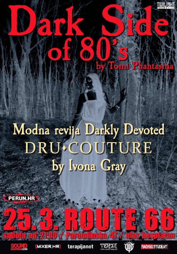 U subotu 25. ožujka će se u zagrebačkom klubu Route 66 održati Dark Side of 80’s Party, jedan od dugovječnijih partija zagrebačkog poznatog alter dj-a Tomi Phantasma. Dark Side Of 80’s je prošao mnoge zagrebačke klubove od Jabuke, Boogaloo Cluba, Močvare, a sada stigao i do Route 66 koji je u posljednje vrijeme postao okupljalište dark scene sa nekoliko tematskih partija i Alternativnim buvljakom. Dark Side of 80’s tematski obrađuje zlatno doba Dark scene, od kraja sedamdesetih do kraja osamdesetih pa su tako na repertoaru Joy Division, Bauhaus, The Cure, Siouxsie & The Banshees, David Bowie, Christian Death, The Sisters Of Mercy, The Cult, Virgin Prunes, Red Lorry Yellow Lorry, Sex Gang Children, Danse Society, Jesus & The Mary Chain, Gang Of Four, The Cramps, Pixies, Echo & The Bunnymen, Love & Rockets, Peter Murphy, The Smiths, DAF, Cabaret Voltaire, Gary Numan, Nitzer Ebb, Front 242, Borghesia, Laibach, Mizar, EKV, Cassandra Complex, Clan Of Xymox, Simple Minds, New Order, A Flock Of Seagulls, Ultravox, OMD, Soft Cell, Depeche Mode,…..a naravno i noviji bandovi koji sviraju glazbu an temeljima 80’s darkeraja poput Placebo, Editors, She Wants Revenge, Nine Inch Nails, Marylin Manson, Covenant, London After Midnight, Heroes Del Silencio, White Lies,…