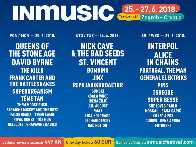Impresivan glazbeni program INmusic festivala #13 je i službeno u cijelosti poznat – uključujući neka od najvećih rock imena današnjice poput Queens Of The Stone Age, Nick Cave & The Bad Seeds, Interpol, Alice in Chains, David Byrne, St. Vincent, Portugal. The Man, The Kills, Frank Carter & The Rattlesnakes, PINS; vrsne world music autore poput Bombina, Tshegue i Témé Tan; nove i svježe nade globalne i europske scene poput Superorganism, Reykjavíkurdætur, General Elektriks, Super Besse, Straight Mickey and The Boyz, Sana Garić, Koala Voice, False Heads, Futurski, Rival Bones i Bad Notion; do cijelog spektra propulzivne i ambiciozne domaće scene – na INmusicu gostuju Jinx, Šumski, She Loves Pablo, Them Moose Rush, Moskau, Irena Žilić, J.R. August, Tyger Lamb, Tus Nua, Nellcote, Lika Kolorado, Zmaj, Cubies, Grapevine Babies, Ischariotzcky i Rens Argoa.