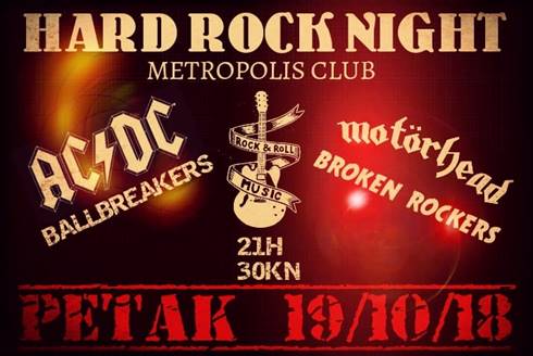Za sve ljubitelje žestokog zvuka, Metropolis Club je spremio pravu poslasticu. Program pod nazivom Hard Rock Night dovodi nam u petak 19.10, 2018 dva vrhunska banda koja autentično izvode hitove ACDC i Motörheada! Ballbreakersi i Broken Rockersi sviraju već godinama po zagrebačkim i hrvatskim binama legendarne hitove AC/DC-ja i Motörheada i to im stvarno odlično ide.