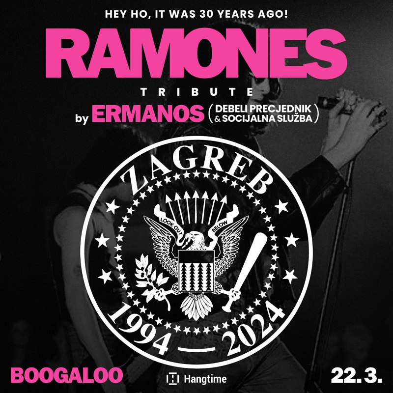 HEY HO! U petak, 22. ožujka u Boogaloou će se obilježiti 50 godina od osnivanja “očeva punka”, Ramonesa! Upravo tim povodom okupljena je svojevrsna domaća underground/punk supergrupa koju čine članovi osječke punk institucije DEBELI PRECJEDNIK (Koca) i zagrebačke hardcore punk atrakcije SOCIJALNA SLUŽBA (Brane, Korado, Enio) okupljeni pod imenom ERMANOS (lat. braća / anagram RAMONES). Ulaznice po pretprodajnoj cijeni od 13 eura mogu se kupiti u Dirty Old Shopu (Tratinska 34) i na njihovom webu, a ako ih ostane, koštat će 16 eura na ulazu.