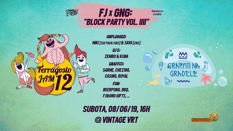 Prijateljski povezani festivali Ferragosto JAM i Graffiti na Gradele organiziraju 8. lipnja Block party druženje u ljetnom vrtu Vintage Industriala kao uvod u svoja nadolazeća izdanja. U planu je popodnevno crtanje grafita, zabavne nagradne igre, roštilj, DJ nastupi i večernja akustična svirka. Ulaz je slobodan.