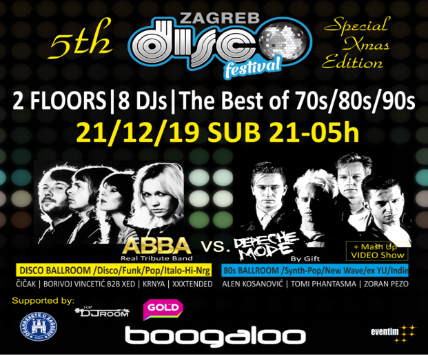 U subotu, 21.12. u zagrebačkom klubu Boogaloo održat će se peto izdanje Zagreb Disco Festivala. Za čak osam sati kvalitetnog program na dva tematska plesna podija zaduženo će biti osam DJ-eva i dva benda, a to su ABBA real tribute iz Ljubljane i Depeche Mode tribute Gift iz Novog Sada. Nakon što su loyalty i early bird ulaznice rasprodane, ulaznice po pretprodajnoj cijeni od 100 kuna dostupne su do subote u 20h preko sustava Eventim ili u Boogaloou (petak od 10 do 16h), na ulazu će koštati 120 kuna.