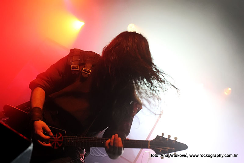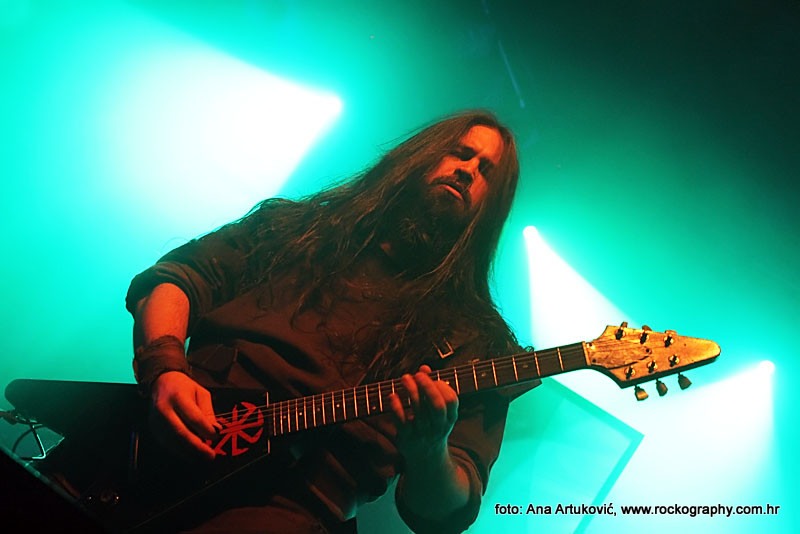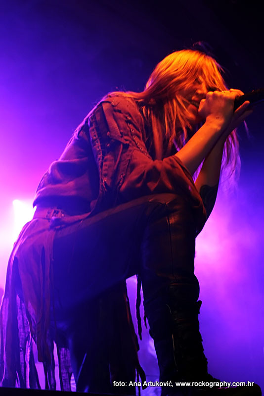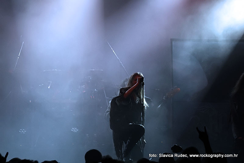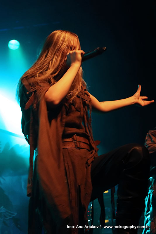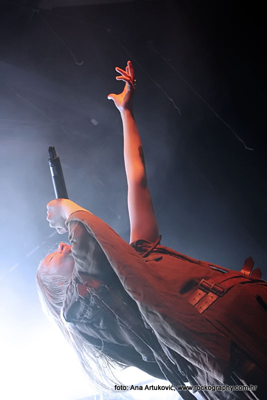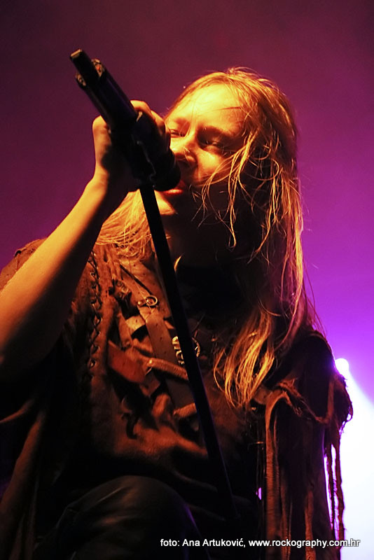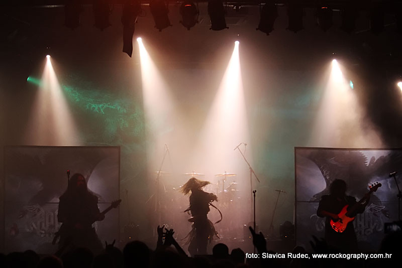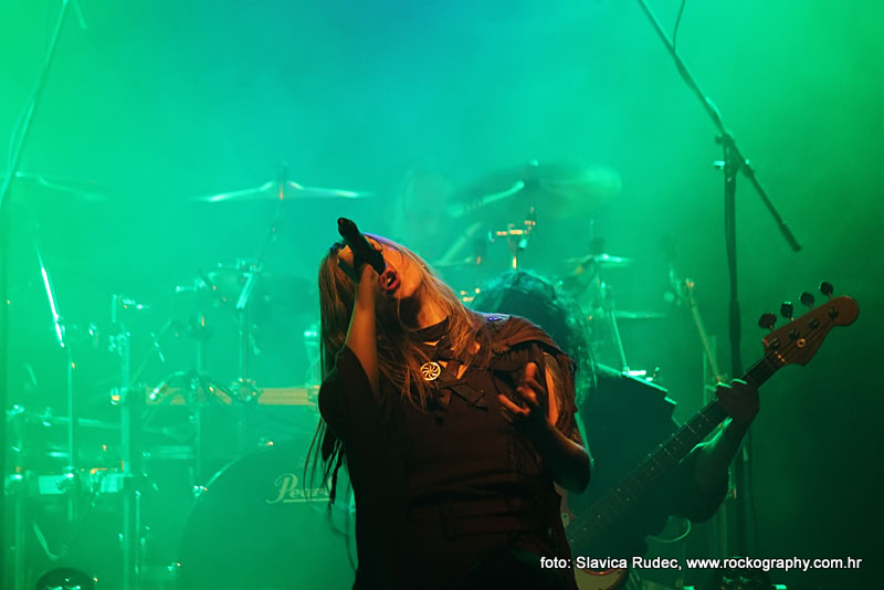 U 20:30 Tvornicom je počeo odjekivati uvodni intro za vrijeme kojeg su se članovi benda, a naposlijetku i sama Masha (s razlogom zvana) ‘Scream’. popeli na stage i otvorili s ‘Yav’, naslovnom pjesmom s njihovog istoimenog posljednjeg albuma. Čudo kako tako naizgled nježna i krhka žena može iz sebe pustiti takve zvukove. S jedne strane prelijepi clean vokali s etno prizvucima, i onda najednom growlanje iz dubine utrobe. Ovo mi je treći put da ih gledam, tj. slušam. Prvi put sam ih vidjela u Sisku, zatim na Metalcampu, gdje su nastupom usred bijela dana po onakvoj vrućini izazvali takav lom među publikom (čak su i zaštitari dopustili crowd surfing skroz do foto pita) kakav nisam vidjela od nijednog benda koji je nastupao preko dana u svom trogodišnjem pohodu na Metalcamp. Iako je publika za vrijeme njihovog nastupa gotovo neprestano skakala i imala ruke u zraku, a moglo se vidjeti i poneko ‘odvrtanje žarulja’, hehe, nije mi to bilo to od strane publike. S druge strane, ni nastup Arkone nije bio među njihovim najboljima. Možda je razlog tome i to što je Mašinom sinu uskoro rođendan, a ona opet neće moći biti s njim radi turneje. U svakom slučaju, Mashino neprestano skakanje i dinamičnost na pozornici je za svaku pohvalu, ali nije se obraćala previše publici, a i ono što je progovorila bilo je na ruskom, osim što je 2-3 puta rekla Hvala, Zagreb!…uz to, vidjelo se da su nastup odradili pomalo nezainteresirano. Joj da, i zvuk, odnosno zvuk vokala, je bio na momente loš. Uglavnom, njihova set lista od deset pjesama obuhvatila je i stare i nove stvari, od kojih su najzapaženije prošle ipak one već dobro poznate poput ‘Goi, Rode, Goi’, ‘Ot Serdtsa k Nebu’, ‘Liki Bessmertnykh Bogov’, ‘Pamyat’, ‘Stenka na Stenku’ i na kraju ‘Yarilo’. Unatoč neumornom zvanju i skandiranju publike, bisa nije bilo.